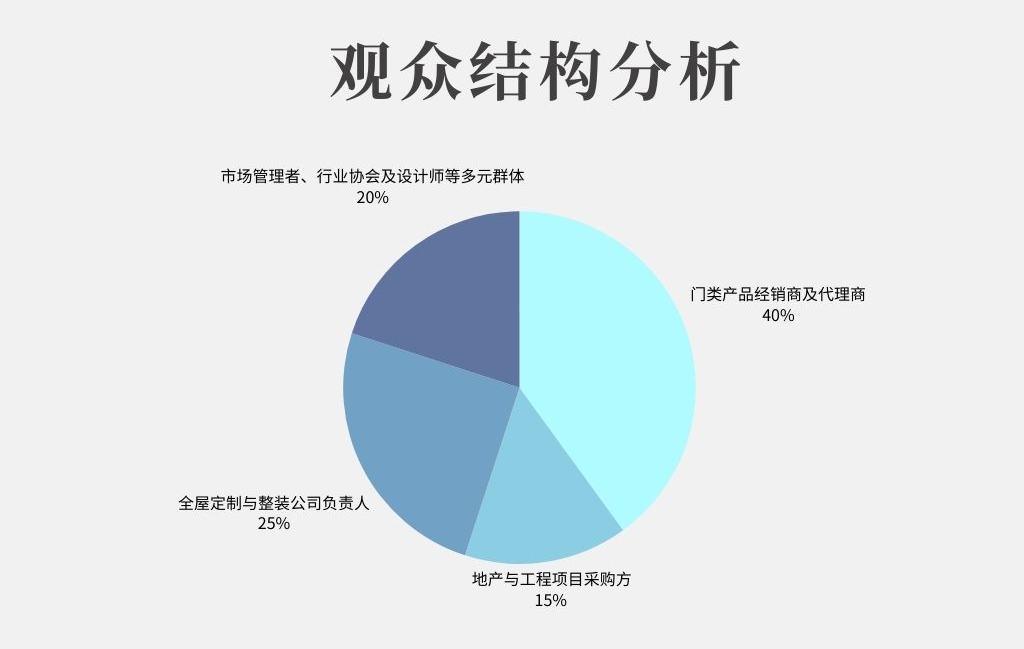 从观众结构分析,本次邀约高度精准且层次分明:其中,门类产品经销商及代理商占比约40%,构成采购主力;全屋定制与整装公司负责人占比约25%,寻求系统解决方案;地产与工程项目采购方占比约15%,瞄准大宗集采机会;其余为市场管理者、行业协会及设计师等多元群体,合计约占20%。