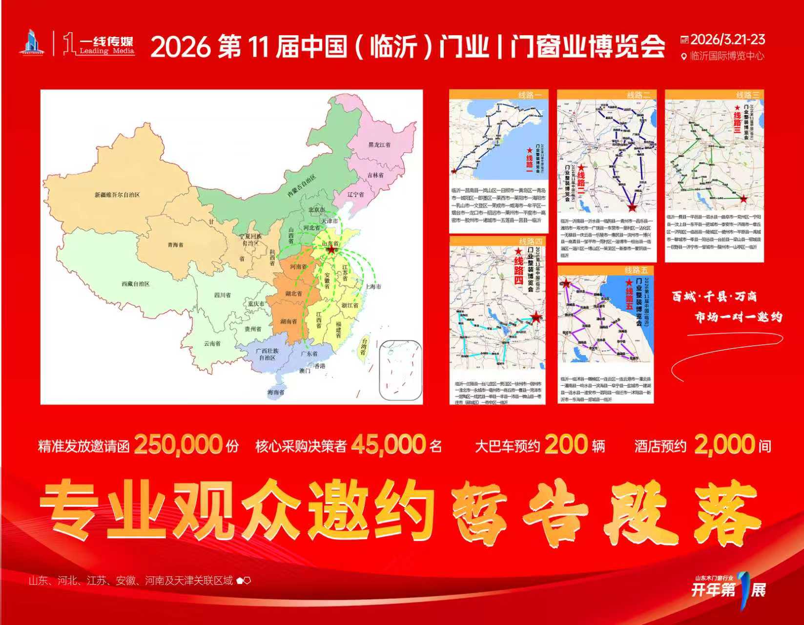 截至目前“观众邀约万里行”活动现已圆满落下帷幕。在这场意义非凡的行动中,我们全力以赴,凭借专业的策略、精准的执行,深入市场腹地,只为搭建起一座连接行业各方的桥梁。3 月 21 日 - 23 日于临沂国际博览中心,共赴这场专业、精彩的门窗盛会,携手开启行业新未来!
